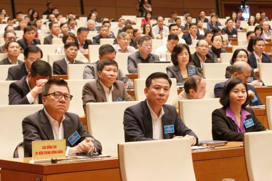 Các đại biểu tham dự hội nghị quán triệt việc tổ chức, thực hiện Nghị quyết 18-NQ/TƯ tại điểm cầu Nhà Quốc hội. Ảnh: Đình Hiệp