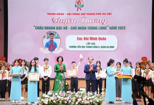 Phó Trưởng ban Thường trực Ban Tuyên giáo và Dân vận Trung ương Phạm Tất Thắng, Phó Chủ tịch Thường trực HĐND thành phố Hà Nội Phùng Thị Hồng Hà trao khen thưởng thiếu nhi có thành tích xuất sắc tiêu biểu
