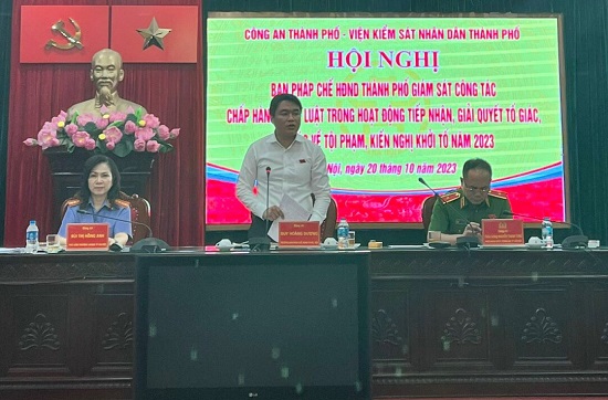 Ngày 20/10/2023, đoàn giám sát của Ban Pháp chế HĐND thành phố Hà Nội làm việc với Công an và Viện Kiểm sát nhân dân Thành phố về công tác chấp hành pháp luật trong hoạt động tiếp nhận, giải quyết tố giác, tin báo về tội phạm, kiến nghị khởi tố trên địa bàn thành phố.