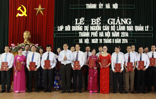 Thành ủy Hà Nội vừa tổ chức lễ bế giảng lớp bồi dưỡng dự nguồn cán bộ lãnh đạo, quản lý TP Hà Nội năm 2014. Lớp bồi dưỡng dự nguồn cán bộ lãnh đạo, quản lý TP Hà Nội năm 2014 có 106 học viên, trong đó, có 59 học viên là cán bộ lãnh đạo các sở, ban, ngành; 41 học viên là lãnh đạo các quận, huyện, thị xã; 4 học viên lãnh đạo các đảng ủy khối và 2 học viên là lãnh đạo doanh nghiệp. Sau 2 tháng học tập trung, đã giúp cho các học viên nâng cao nhận thức một cách có hệ thống và nắm chắc hơn quan điểm, đường lối của Đảng, chính sách pháp luật của Nhà nước; trang bị hệ thống kiến thức cơ bản về lý luận và thực tiễn và một số kỹ năng nhằm góp phần củng cố nhận thức về chính trị - xã hội, lập trường cách mạng, năng lực quản lý; rèn luyện, bồi dưỡng đạo đức cách mạng, tác phong và trách nhiệm công vụ của người cán bộ lãnh đạo, quản lý trước yêu cầu sự nghiệp công nghiệp hóa – hiện đại hóa, xây dựng và phát triển Thủ đô, đất nước trong điều kiện hội nhập quốc tế hiện nay. Đặc biệt, qua thời gian học tập, các học viên có điều kiện để chia sẻ kinh nghiệm, tăng cường gắn bó, kết hợp trong công tác, từ đó, cùng tham gia thực hiện hiệu quả các nhiệm vụ về cải cách hành chính, phát triển kinh tế - xã hội, an ninh quốc phòng của từng địa phương, đơn vị và toàn TP.