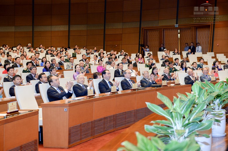 Quốc hội kêu gọi đồng bào, chiến sĩ cả nước, đồng bào ta ở nước ngoài tiếp tục truyền thống yêu nước, đoàn kết dân tộc, nêu cao ý chí tự lực, tự cường, phát huy mọi nguồn lực trong nước, chủ động nắm bắt các cơ hội hợp tác quốc tế để tạo đà, thúc đẩy phát triển kinh tế, xã hội, văn hóa, giáo dục, khoa học, công nghệ, bảo đảm an ninh chính trị, trật tự an toàn xã hội, kiên quyết, kiên trì bảo vệ vững chắc độc lập, chủ quyền và toàn vẹn lãnh thổ, góp phần đưa đất nước phát triển toàn diện, vững chắc, đạt mục tiêu dân giàu, nước mạnh, dân chủ, công bằng, văn minh, góp phần thực hiện thắng lợi Nghị quyết Đại hội lần thứ XII của Đảng.