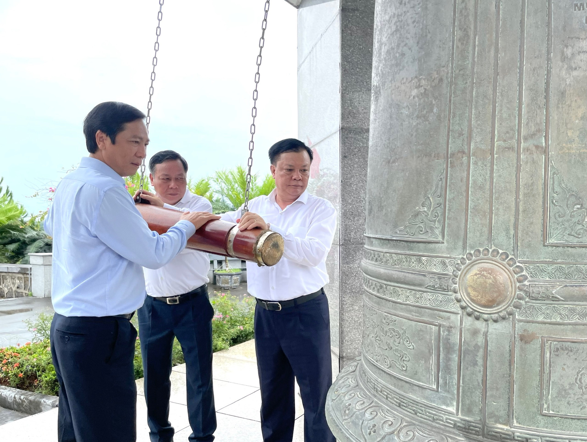 Bí thư Thành ủy Đinh Tiến Dũng, Phó Bí thư Thành ủy Nguyễn Văn Phong và đại diện tỉnh Quảng Trị thỉnh chuông trong lễ tưởng niệm các anh hùng liệt sĩ tại Nghĩa trang Đường 9.