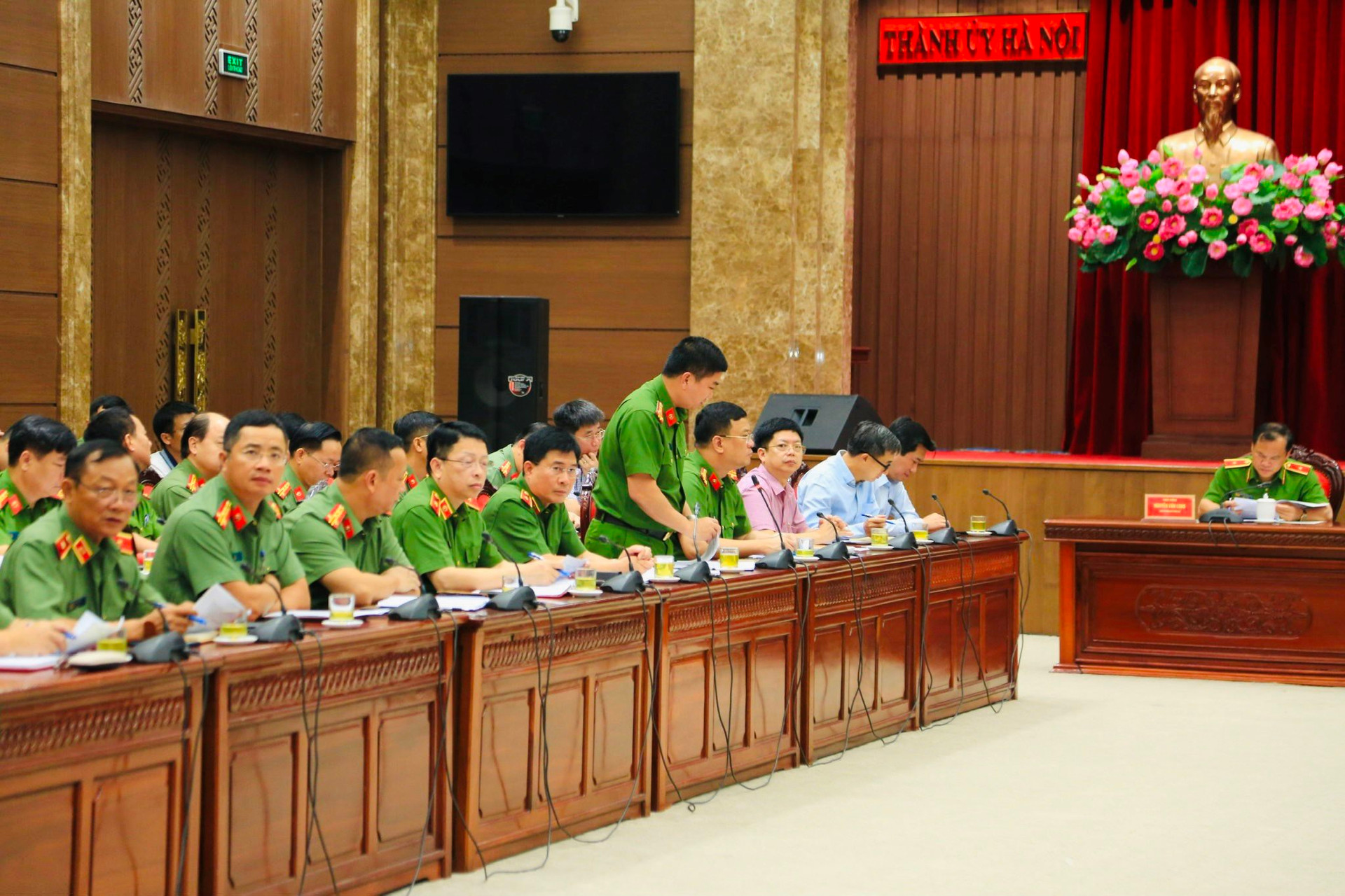 Đại diện Công an thành phố Hà Nội báo cáo tình hình diễn biến vụ cháy.