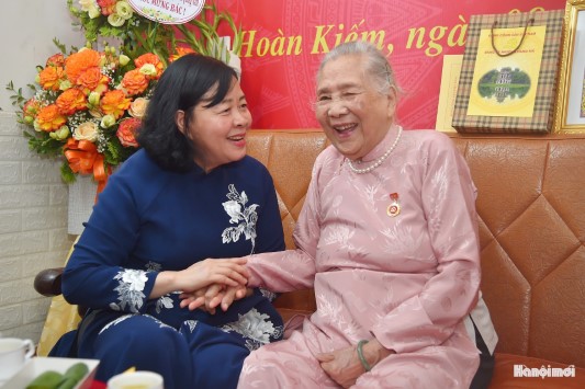 Bí thư Thành ủy Hà Nội Bùi Thị Minh Hoài trò chuyện với đồng chí Lê Thị Ngọc. Ảnh: Viết Thành