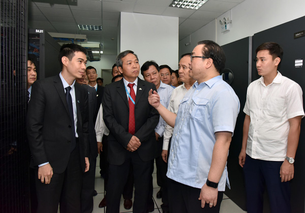 Trước khi làm việc với Quận ủy Cầu Giấy, Bí thư Thành ủy Hoàng Trung Hải đã đến thăm và làm việc với Tập đoàn Công nghệ CMC đóng trên địa bàn quận.