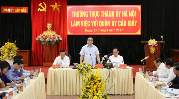 Sáng 13-4, Ủy viên Bộ Chính trị, Bí thư Thành ủy Hà Nội Hoàng Trung Hải làm việc với Quận ủy Cầu Giấy về kết quả thực hiện nhiệm vụ 3 tháng đầu năm, triển khai nhiệm vụ 9 tháng cuối năm 2017 và trọng tâm công tác trong thời gian tới.
