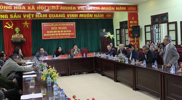 * Tại huyện Thanh Trì, cử tri huyện Thanh Trì đánh giá cao kết quả kỳ họp, đặc biệt việc Quốc hội đã xem xét thông qua Luật Thủ đô. Cử tri cũng tán thành cao khi Nghị quyết về việc lấy phiếu tín nhiệm, bỏ phiếu tín nhiệm đối với người giữ chức vụ do Quốc hội, HĐND bầu hoặc phê chuẩn đã được thông qua và chính thức có hiệu lực từ tháng 2/2013. Cử tri mong muốn Quốc hội tiếp tục phát huy tinh thần đổi mới, dân chủ, thẳng thắn thảo luận của các đại biểu, khẳng định vai trò của Quốc hội, cơ quan quyền lực Nhà nước cao nhất.