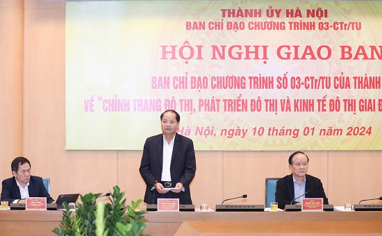 Sáng 10/01/2024, Ban Chỉ đạo Chương trình số 03-CTr/TU của Thành ủy Hà Nội về “Chỉnh trang đô thị, phát triển đô thị và kinh tế đô thị giai đoạn 2021-2025” (Chương trình số 03) đã tổ chức hội nghị giao ban, đánh giá kết quả thực hiện năm 2023 và triển khai nhiệm vụ trọng tâm năm 2024. Phó Bí thư Thành ủy, Chủ tịch HĐND thành phố Hà Nội, Trưởng ban chỉ đạo Chương trình số 03-CTr/TU Nguyễn Ngọc Tuấn chủ trì hội nghị.
