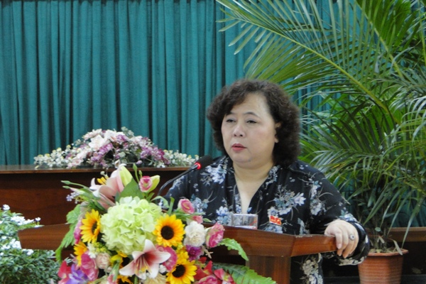 Chủ tịch HĐND TP Nguyễn Thị Bích Ngọc phát biểu tại buổi tiếp xúc cử tri quận Hà Đông