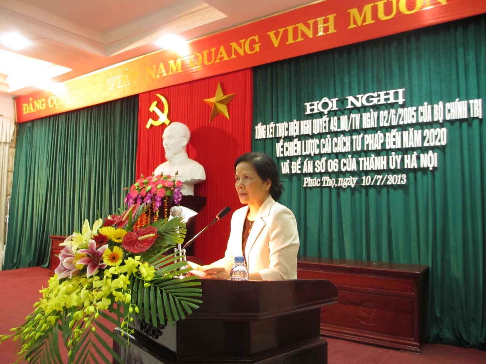Chiều ngày 10/7/2013, Huyện ủy Phúc Thọ tổ chức Hội nghị tổng kết 8 năm thực hiện Nghị quyết số 49-NQ/TW ngày 02/6/2005 của Bộ Chính trị và Đề án số 06-ĐA/TU của Thành ủy Hà Nội về “Chiến lược cải cách Tư pháp đến năm 2020”. Đồng chí Ngô Thị Doãn Thanh, Ủy viên Trung ương Đảng, Phó Bí thư Thành ủy, Chủ tịch HĐND Thành phố đã tới dự và chỉ đạo. Trong những năm qua, thực hiện Nghị quyết số 49-NQ/TW ngày 02/6/2005 của Bộ Chính trị về “Chiến lược cải cách tư pháp đến năm 2020”, cả nước nói chung và trên địa bàn thành phố Hà Nội nói riêng, công cuộc cải cách tư pháp đã được các cấp ủy, tổ chức đảng lãnh đạo và tổ chức thực hiện với quyết tâm cao, đạt được nhiều kết quả.