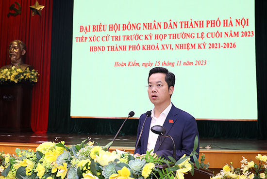 Tại buổi tiếp xúc, thay mặt Tổ đại biểu HĐND Thành phố, đại biểu Vũ Đăng Định - Bí thư Quận uỷ Hoàn Kiếm đã thông báo với cử tri về nội dung, thời gian và công tác chuẩn bị tổ chức Kỳ họp thường lệ cuối năm 2023 (kỳ họp thứ 14) HĐND Thành phố khóa XVI, nhiệm kỳ 2021-2026. Tiếp đó, đại biểu Chu Hồng Minh - Bí thư Thành đoàn Hà Nội báo cáo về tình hình thực hiện kế hoạch phát triển kinh tế - xã hội năm 2023 và kế hoạch phát triển kinh tế - xã hội năm 2024 trên địa bàn Thành phố; báo cáo kết quả giải quyết kiến nghị của cử tri tại kỳ tiếp xúc trước.
