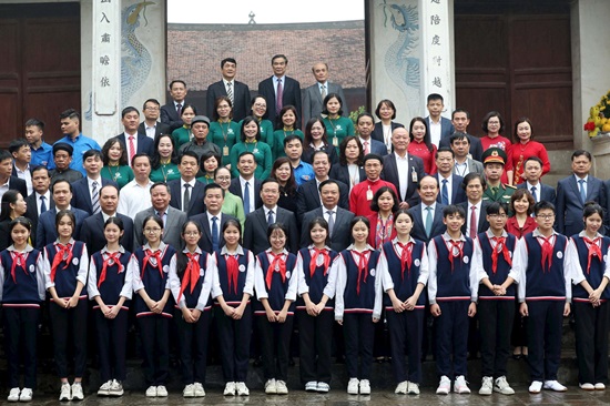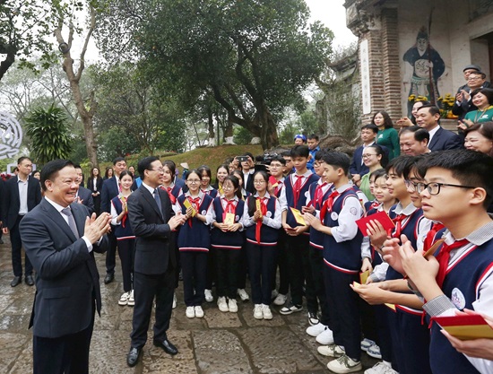 Chủ tịch nước Võ Văn Thưởng và Bí thư Thành ủy Hà Nội Đinh Tiến Dũng với các học sinh huyện Đông Anh tại Khu di tích Cổ Loa.