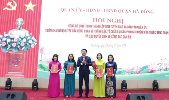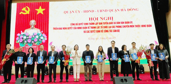 Chiều 28/2/2025, Quận ủy, HĐND, UBND quận Hà Đông tổ chức Hội nghị công bố quyết định thành lập Ban Tuyên giáo và Dân vận Quận ủy; triển khai Nghị quyết của HĐND quận về thành lập, tổ chức lại các phòng chuyên môn thuộc UBND quận và các quyết định về công tác cán bộ.