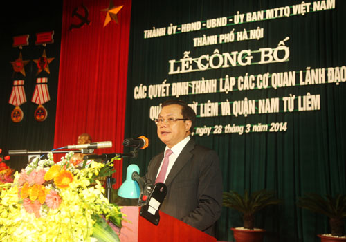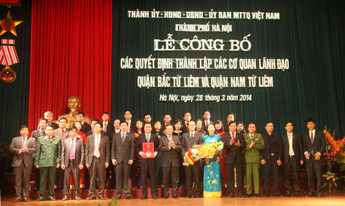 Sáng 28/3, Thành ủy - HĐND - UBND - UB MTTQ TP Hà Nội đã tổ chức Lễ công bố các quyết định thành lập các cơ quan lãnh đạo Quận Bắc Từ Liêm và Nam Từ Liêm. Tham dự buổi lễ có các đồng chí: Phạm Quang Nghị, Ủy viên Bộ Chính trị, Bí thư Thành ủy; Ngô Thị Doãn Thanh, Ủy viên Trung ương Đảng, Phó Bí thư Thành ủy, Chủ tịch HĐND TP; Nguyễn Thế Thảo, Ủy viên Trung ương Đảng, Phó Bí thư Thành ủy, Chủ tịch UBND TP…