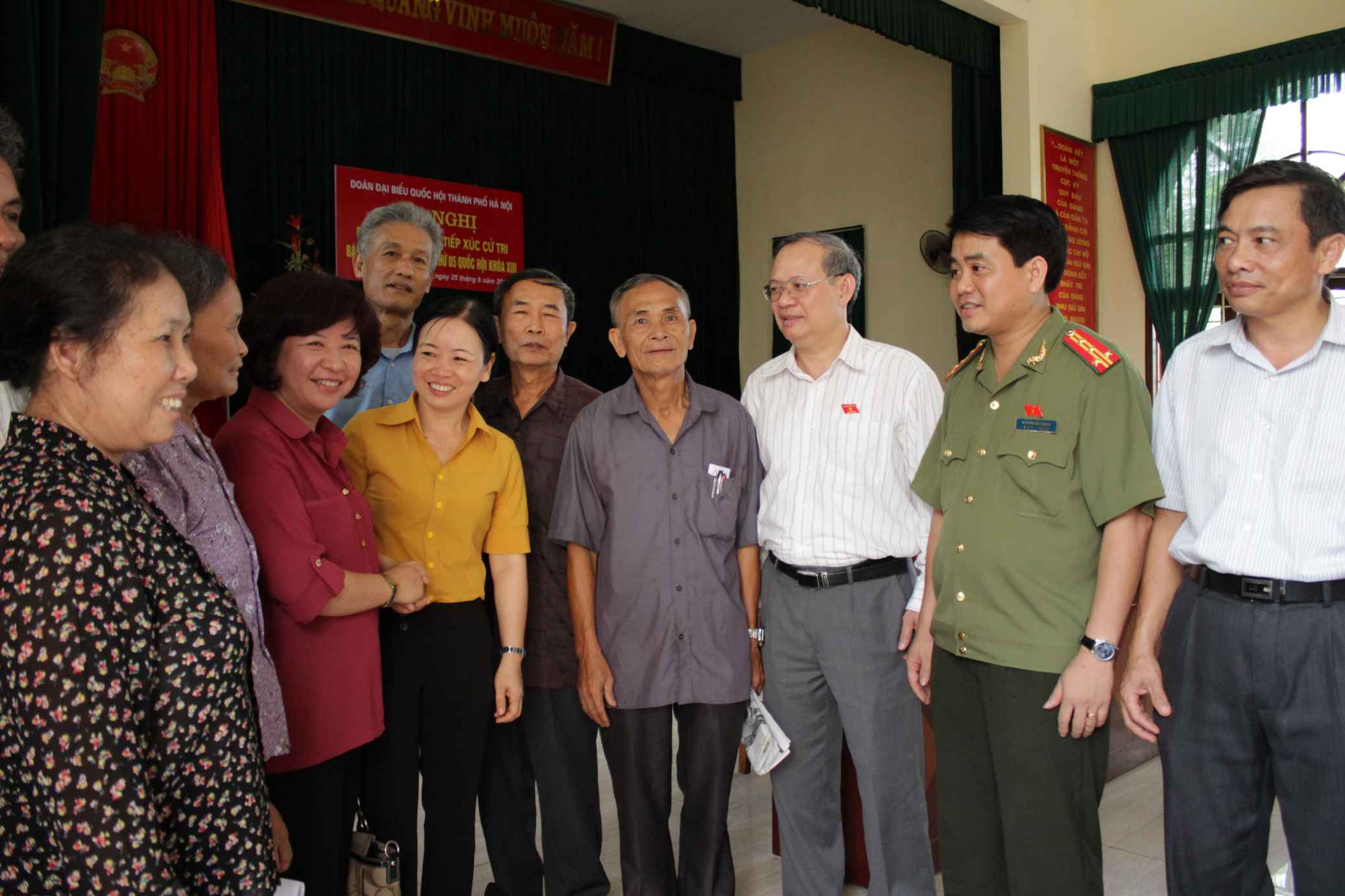 Chiều 25/6, các ĐBQH TP Hà Nội ứng cử tại đơn vị bầu cử số 5 (Ông Đinh Xuân Thảo, Viện trưởng Viện Nghiên cứu lập pháp thuộc Ủy ban Thường vụ Quốc hội; Đại tá Nguyễn Đức Chung, Giám đốc Công an thành phố Hà Nội; Bà Nguyễn Phạm Ý Nhi, Giám đốc bệnh viện đa khoa Xanh Pôn) đã tiếp xúc với cử tri huyện Hoài Đức tại xã Đắc Sở, báo cáo kết quả Kỳ họp thứ 5, Quốc hội khóa XIII.