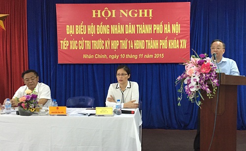 Tiếp xúc với cử tri quận Thanh Xuân trong sáng ngày 10/11/2015 tại trụ sở UBND phường Nhân Chính, cử tri kiến nghị với đại biểu HĐND TP: Đẩy nhanh tiến tiến độ thi công công trình thoát nước vành đai 2, cấp giấy chứng nhận quyền sử dụng đất đối với các công trình di tích lịch sử ở phường Phương Liệt, thực hiện đền bù thỏa đáng cho nhân dân khi thu hồi đất để thực hiện dự án xây dựng đường vành đai 3, bố trí nhà sinh hoạt cộng đồng tại khu nhà tái định cư ở phường Nhân Chính…