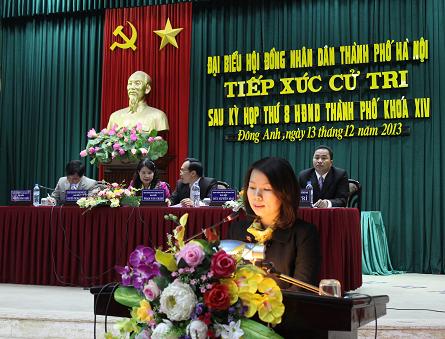Sáng 13-12 các đại biểu HĐND Thành phố gồm: Phạm Văn Châm - Phó Bí thư Huyện uỷ, Chủ tịch UBND huyện Đông Anh; Nguyễn Thị Mai Sương - Giám đốc Ngân hàng nhà nước Việt Nam Chi nhánh Hà Nội; Bùi Huyền Mai - Phó trưởng Ban Pháp chế HĐND thành phố Hà Nội; Nguyễn Đình Chiến - Chủ tịch UBND xã Vân Hà đã có buổi tiếp xúc cử tri sau kỳ họp thứ tám HĐND Thành phố khóa XIV tại đơn vị bầu cử số 21 huyện Đông Anh.