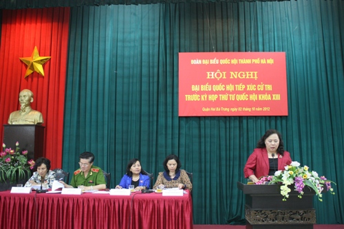 * Chiều cùng ngày, cử tri quận Hai Bà Trưng đã kiến nghị với các đại biểu Quốc hội một số vấn đề về công tác quản lý xây dựng, môi trường đô thị, an ninh trật tự ở các khu phố, an sinh xã hội, công tác y tế, vấn đề nghiên cứu, ban hành và thực thi các luật…