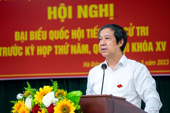 Sáng 8/5/2023, Bộ trưởng Bộ Giáo dục và Đào tạo (GDĐT) Nguyễn Kim Sơn cùng các đại biểu Quốc hội đơn vị bầu cử số 6 thành phố Hà Nội đã tham dự Hội nghị tiếp xúc cử tri quận Hà Đông trước Kỳ họp thứ 5, Quốc hội khoá XV.