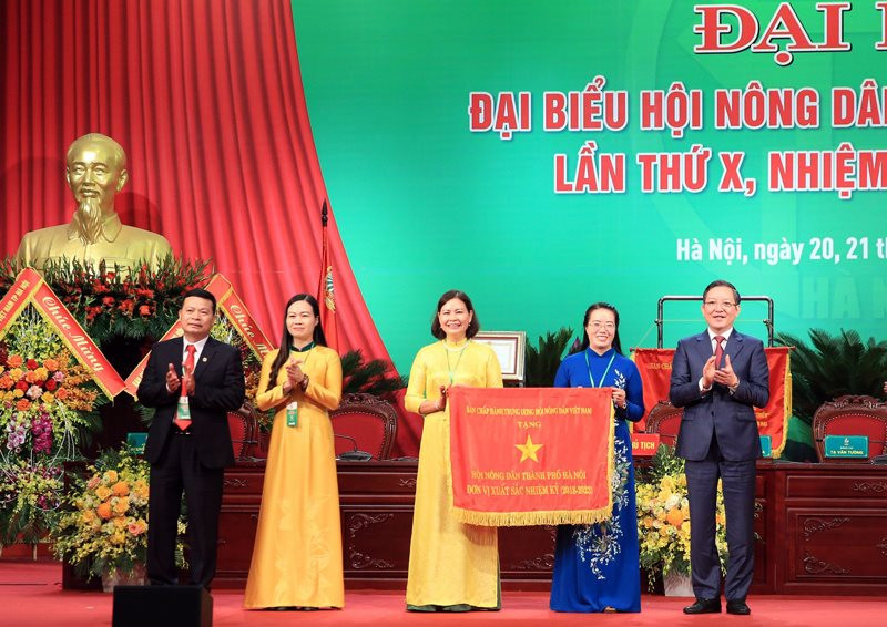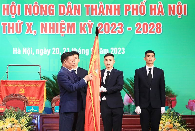 Chủ tịch Hội Nông dân Việt Nam Lương Quốc Đoàn trao cờ thi đua xuất sắc cho Hội Nông dân thành phố Hà Nội.