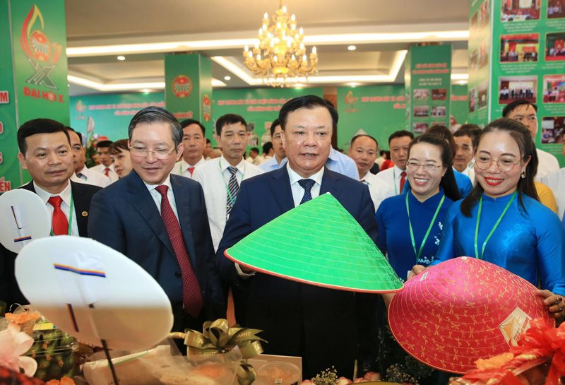 Bí thư Thành ủy Hà Nội Đinh Tiến Dũng, Chủ tịch Hội Nông dân Việt Nam Lương Quốc Đoàn và các đại biểu tham quan khu trưng bày giới thiệu sản phẩm nông nghiệp tiêu biểu, sản phẩm OCOP của nông dân Thủ đô.
