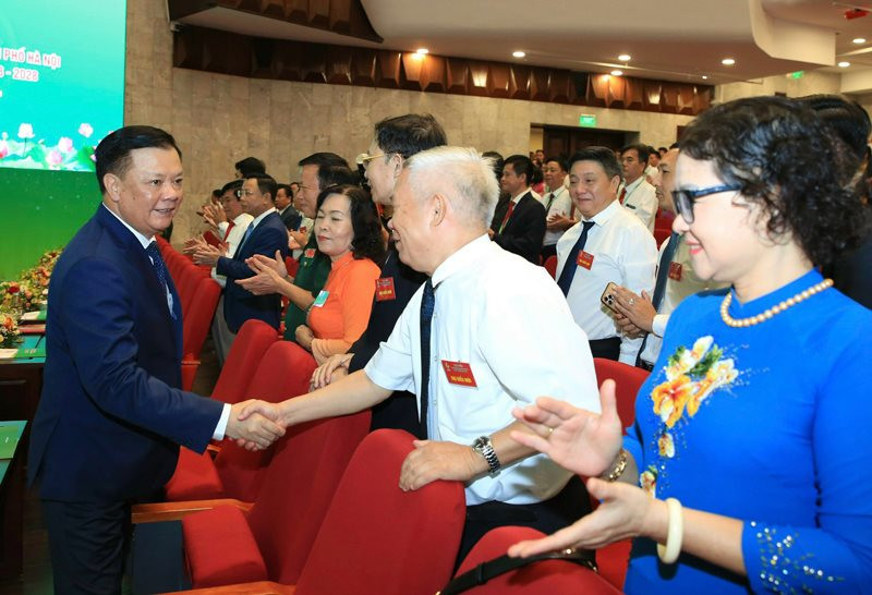 Bí thư Thành ủy Hà Nội Đinh Tiến Dũng với các đại biểu dự đại hội.