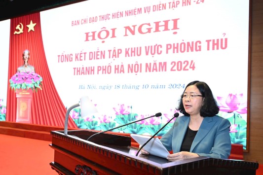 Phát biểu chỉ đạo tại hội nghị, Bí thư Thành ủy Hà Nội Bùi Thị Minh Hoài khẳng định, cuộc diễn tập KVPT Hà Nội năm 2024 đã nâng cao nhận thức, trách nhiệm về nhiệm vụ quốc phòng, an ninh và bảo vệ Tổ quốc cho Đảng bộ, chính quyền, nhân dân và lực lượng vũ trang Thủ đô. Đặc biệt là nâng cao năng lực lãnh đạo của cấp ủy Đảng, điều hành của chính quyền, vai trò tham mưu của cơ quan quân sự, công an và các ban, sở, ngành, đoàn thể; trình độ tổ chức chỉ huy hiệp đồng tác chiến của lực lượng vũ trang; tiếp tục bổ sung, điều chỉnh, xây dựng và hoàn thiện phương án tác chiến, chủ động xử lý các tình huống xảy ra, không để bị động, bất ngờ, góp phần giữ vững ổn định chính trị, trật tự an toàn xã hội trên địa bàn thành phố, tạo môi trường thuận lợi để thúc đẩy phát triển kinh tế - xã hội vững chắc trong thời kỳ mở rộng hợp tác quốc tế toàn cầu; tạo ra thế và lực mới cho Thủ đô trong quá trình hội nhập và phát triển.
