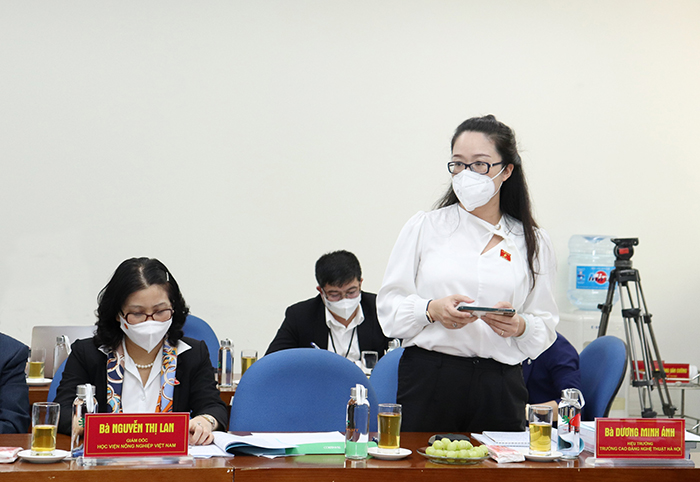 Đại biểu Dương Minh Ánh - Hiệu trưởng Trường Cao đẳng nghệ thuật Hà Nội trao đổi tại buổi giám sát