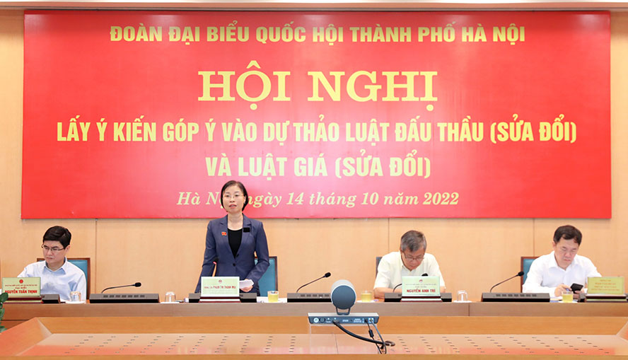 Sáng 14/10/2022, Đoàn đại biểu Quốc hội thành phố Hà Nội tổ chức Hội nghị lấy ý kiến góp ý vào dự thảo Luật Đấu thầu (sửa đổi) và Luật Giá (sửa đổi). Phó Trưởng đoàn chuyên trách Đoàn đại biểu Quốc hội thành phố Hà Nội Phạm Thị Thanh Mai chủ trì hội nghị.
