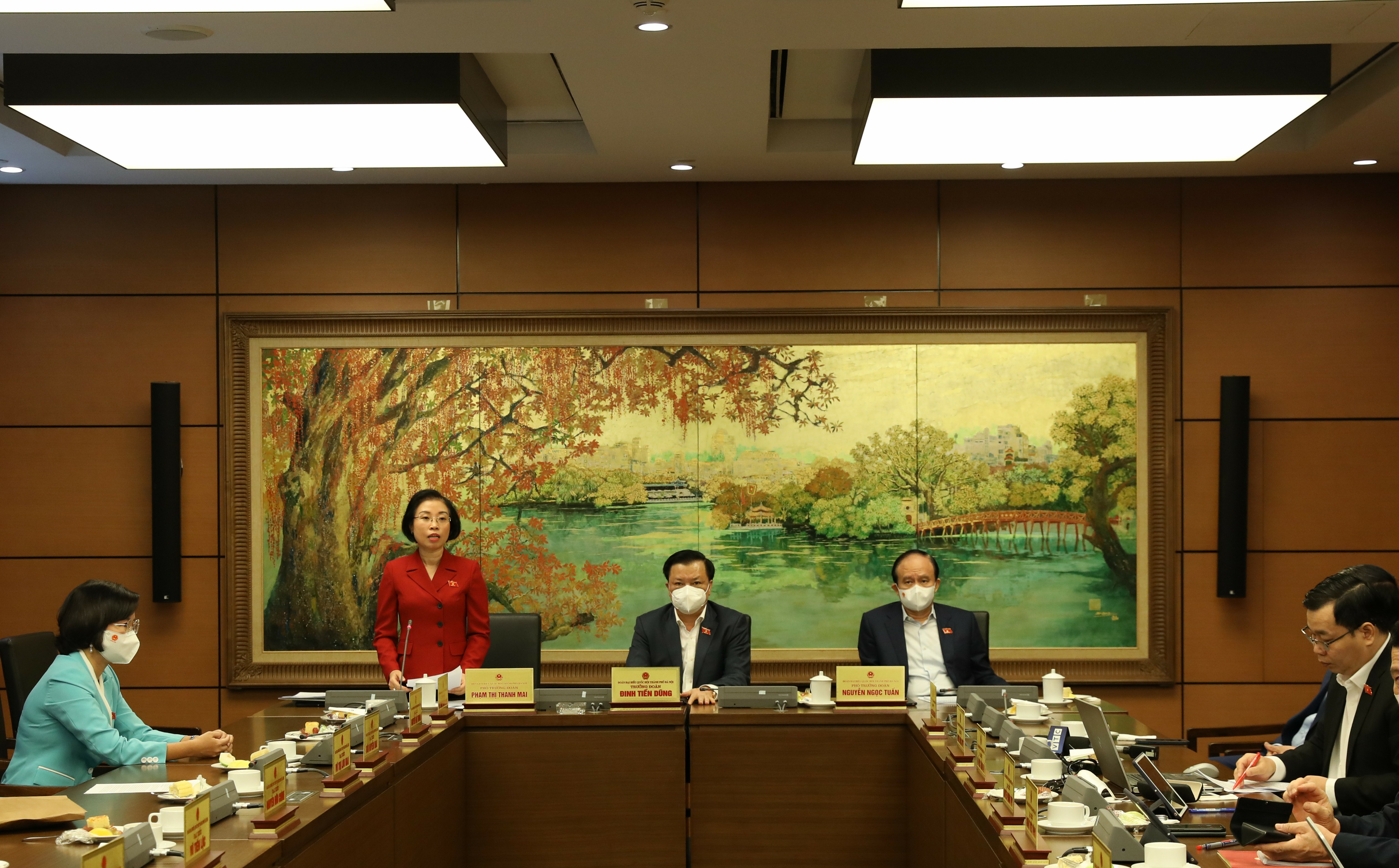 Thành ủy viên, Phó Trưởng Đoàn chuyên trách Đoàn Đại biểu Quốc hội Hà Nội Phạm Thị Thanh Mai điều hành phiên thảo luận Tổ