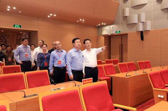 Đoàn cán bộ Thủ đô Vientiane tham quan hội trường nơi diễn ra các kỳ họp của HĐND Thành phố