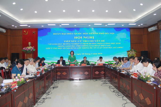 Chiều 28-3, Đoàn đại biểu Quốc hội thành phố Hà Nội tổ chức hội nghị tiếp xúc cử tri chuyên đề: “Giáo dục hướng nghiệp và định hướng phân luồng học sinh trong giáo dục phổ thông giai đoạn hiện nay; góp ý vào một số nội dung lớn trong dự án Luật Giáo dục (sửa đổi)”. Phó Bí thư Thành ủy, Chủ tịch HĐND thành phố, Phó Trưởng đoàn đại biểu Quốc hội TP Hà Nội Nguyễn Thị Bích Ngọc chủ trì hội nghị.