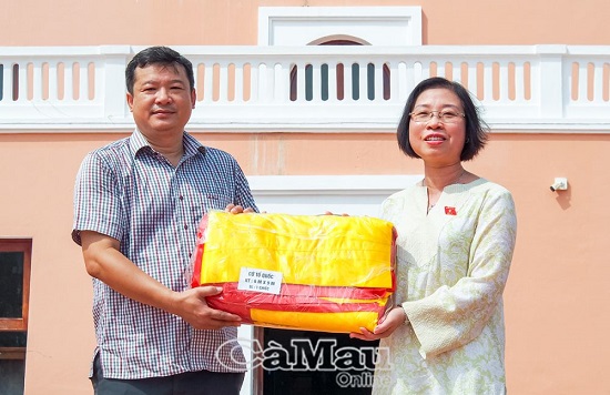 Phó Trưởng đoàn chuyên trách Đoàn đại biểu Quốc hội thành phố Hà Nội Phạm Thị Thanh Mai trao cờ Tổ quốc tới Ban quản lý Khu du lịch Mũi Cà Mau