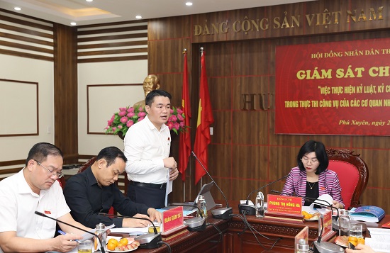 Tại buổi làm việc, thành viên đoàn giám sát đề nghị huyện quan tâm, làm rõ thêm một số thông tin về một số nội dung: Nội dung chỉ số cải cách hành chính của UBND huyện giảm chủ yếu, nguyên nhân, trách nhiệm và giải pháp; kết quả xây dựng quy trình đơn giản hóa và rút ngắn thời gian giải quyết thủ tục hành chính của cấp huyện và cấp xã; kết quả thực hiện xây dựng quy trình giải quyết công việc bộ ngoài thủ tục hành chính của cấp xã; việc tăng cường kiểm tra kỷ luật, kỷ cương hành chính, kỷ luật công vụ và xử lý vi phạm; trách nhiệm trong công tác tiếp công dân, giải quyết khiếu nại, tố cáo, phản ánh của công dân…