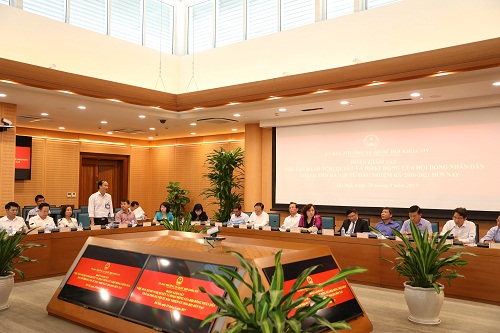 Tại buổi làm việc, đồng chí Nguyễn Ngọc Tuấn,Ủy viên Ban Thường vụ Thành ủy, Phó Chủ tịch Thường trực HĐND Thành phố trình bày báo cáo tóm tắt các hoạt động của HĐND Thành phố thời gian qua, ngay từ đầu nhiệm kỳ, với phương châm không ngừng đổi mới, nâng cao hiệu lực, hiệu quả hoạt động, Thường trực HĐND Thành phố đã cụ thể hóa danh mục các công việc trọng tâm thực hiện theo từng quý, từng tháng; phân công “rõ người, rõ việc, rõ trách nhiệm và rõ hiệu quả”. Trước mỗi kỳ họp, Thường trực HĐND, UBND và Ủy ban MTTQ Việt Nam Thành phố đã thống nhất những nội dung và các Nghị quyết dự kiến sẽ thông qua, báo cáo xin ý kiến của Thường trực Thành ủy. Từ đầu nhiệm kỳ đến nay, HĐND thành phố Hà Nội đã ban hành 49 nghị quyết, trong đó có nhiều Nghị quyết chuyên đề, bám sát các vấn đề của cuộc sống, góp phần thúc đẩy phát triển kinh tế - xã hội của Thành phố. Trong quá trình thực hiện, Thường trực và các ban HĐND Thành phố cũng thường xuyên theo dõi, giám sát chặt chẽ việc tổ chức triển khai để các Nghị quyết phát huy hiệu quả, đi vào thực tiễn.