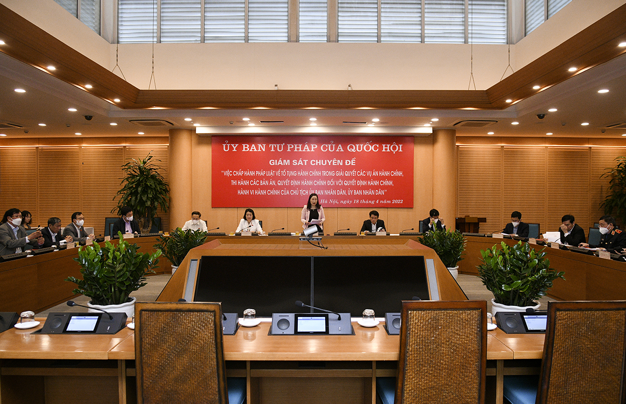 Sáng 18/4, Đoàn giám sát của Ủy ban Tư pháp Quốc hội về “Việc chấp hành pháp luật về tố tụng hành chính trong giải quyết các vụ án hành chính, thi hành các bản án, quyết định hành chính đối với quyết định hành chính, hành vi hành chính của Chủ tịch Ủy ban nhân dân, Ủy ban nhân dân giai đoạn 2019-2021” đã làm việc với các cơ quan của Thành phố Hà Nội.