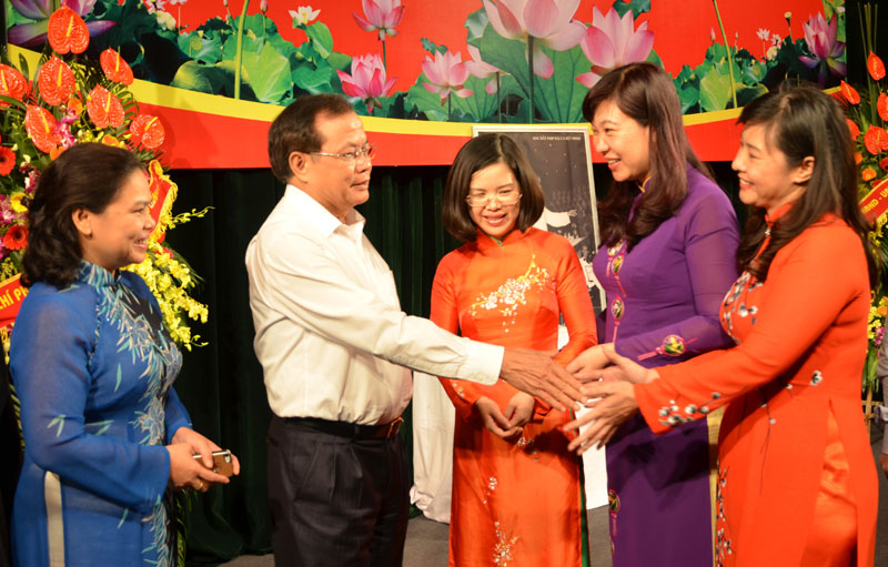 Đồng chí Phạm Quang Nghị trò chuyện với cán bộ nữ các cấp trong Ngày hội Đại đoàn kết dân tộc.