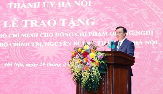 Bí thư Thành ủy Hà Nội nêu rõ, trong suốt hơn 50 năm công tác, cống hiến, trải qua nhiều cương vị, vị trí khác nhau, đồng chí Phạm Quang Nghị luôn trung thành với Đảng, với Tổ quốc, với nhân dân; không ngừng học tập, phấn đấu, rèn luyện, tu dưỡng, giữ gìn, nêu cao và lan tỏa phẩm chất đạo đức cách mạng trong sáng, tính tiền phong, gương mẫu của người cán bộ, đảng viên.