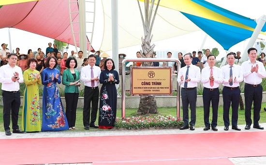 Các đồng chí lãnh đạo thành phố thực hiện nghi thức gắn biển công trình cấp thành phố - Công viên Ngọc Thụy (quận Long Biên)