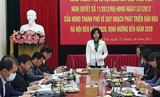 Sáng 22/10, Đoàn giám sát số 1 của HĐND thành phố Hà Nội, do Ủy viên Ban Thường vụ Thành ủy, Phó Chủ tịch Thường trực HĐND thành phố Phùng Thị Hồng Hà làm Trưởng đoàn, đã giám sát tại thị xã Sơn Tây việc thực hiện Nghị quyết số 11/2012/NQ-HĐND ngày 13/7/2012 của HĐND thành phố về Quy hoạch phát triển văn hóa Hà Nội đến năm 2020, định hướng đến năm 2030.