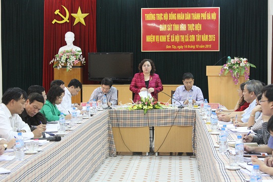 Thực hiện Nghị quyết số 18/2014/NQ-HĐND ngày 05/12/2014 của HĐND Thành phố về chương trình giám sát năm 2015, chiều 14/10, Đoàn giám sát số 1 Thường trực HĐND Thành phố do đồng chí Nguyễn Thị Bích Ngọc, Phó Bí thư Thành ủy, Chủ tịch HĐND Thành phố làm trưởng đoàn đã làm việc với Thị xã Sơn Tây.
