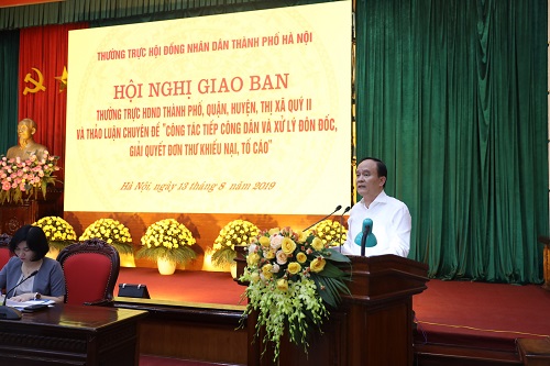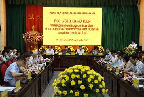 Chiều 13-8, Thường trực HĐND thành phố Hà Nội đã tổ chức hội nghị giao ban với Thường trực HĐND các quận, huyện, thị xã quý II, nhằm đánh giá kết quả hoạt động của HĐND các cấp thành phố 7 tháng của năm 2019, triển khai nhiệm vụ 5 tháng cuối năm; thảo luận chuyên đề về “Công tác tiếp công dân và xử lý, đôn đốc giải quyết đơn thư, khiếu nại, tố cáo của công dân”.