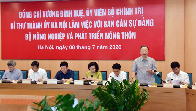 Chiều 8-7, phát biểu tại buổi làm việc với Ban Cán sự đảng Bộ Nông nghiệp và Phát triển nông thôn, đồng chí Vương Đình Huệ, Ủy viên Bộ Chính trị, Bí thư Thành ủy, Trưởng đoàn đại biểu Quốc hội thành phố Hà Nội cho biết, thời gian qua mặc dù chịu tác động mạnh về dịch bệnh, nhưng nông nghiệp, nông thôn và nông dân Thủ đô vẫn phát triển khá toàn diện.