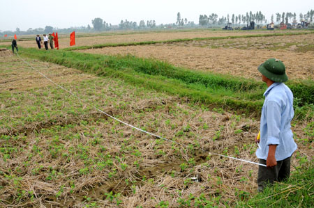 Ảnh: Đo đạc trên thực địa thực hiện dồn điền đổi thửa trên đồng đất Ứng Hòa