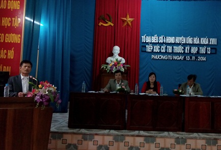 Để chuẩn bị cho Kỳ họp thứ 13 HĐND huyện Ứng Hòa khóa XVIII, ngày 13/11/2014 cả 8 Tổ đại biểu HĐND huyện đã tổ chức hội nghị tiếp xúc cử tri tại các đơn vị bầu cử trên địa bàn huyện.