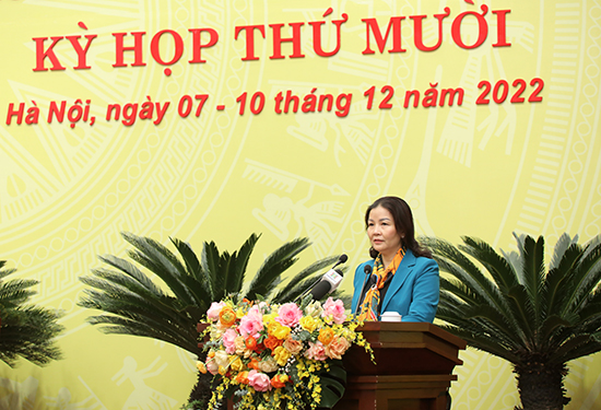 Giám đốc Sở Lao động Thương binh và Xã hội Hà Nội Bạch Liên Hương trình bày Tờ trình của UBND Thành phố tại kỳ họp