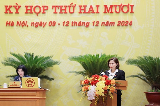 Phó Trưởng ban Văn hóa-Xã hội HĐND Thành phố Hoàng Thị Tú Anh trình bày báo cáo thẩm tra