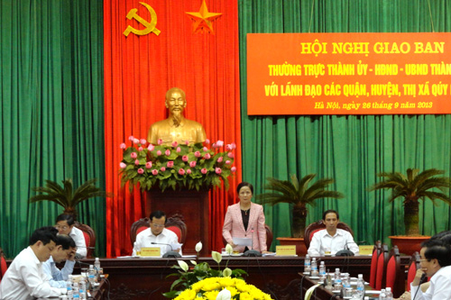 Sáng 26/9, Thường trực Thành ủy - HĐND - UBND TP Hà Nội đã tổ chức hội nghị giao ban với lãnh đạo các quận, huyện, thị xã quý III/2013 về tình hình thu chi ngân sách 9 tháng đầu năm và những giải pháp điều hành ngân sách những tháng cuối năm. Chủ trì hội nghị có Bí thư Thành ủy Phạm Quang Nghị; Phó Bí thư, Chủ tịch HĐND Ngô Thị Doãn Thanh; các Phó Bí thư: Nguyễn Công Soái, Tưởng Phi Chiến.