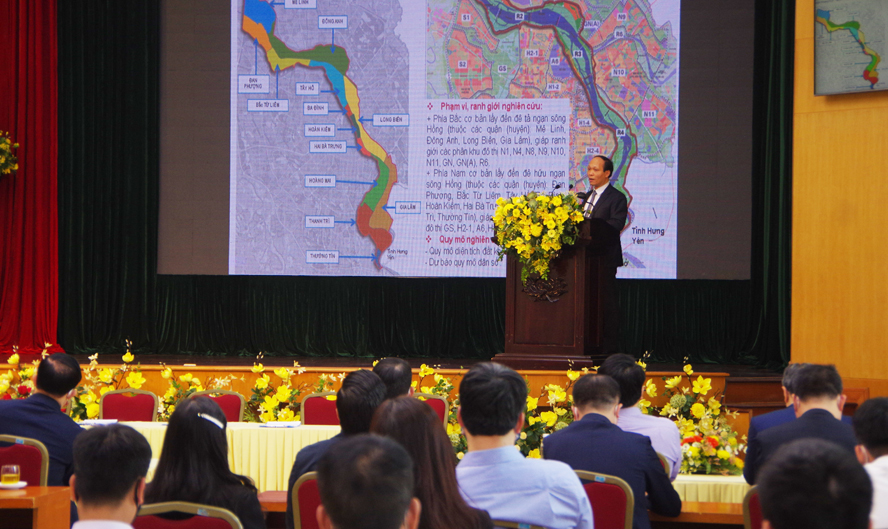 Tại hội nghị, Phó Giám đốc Sở Quy hoạch - Kiến trúc Phạm Quốc Tuyến đã công bố các Quyết định 1045/QĐ-UBND và 1046/QĐ-UBND ngày 25-3-2022 của UBND thành phố Hà Nội phê duyệt hai quy hoạch phân khu đô thị sông Hồng, sông Đuống tỷ lệ 1/5000; Viện trưởng Viện Quy hoạch xây dựng Hà Nội Lưu Quang Huy báo cáo nội dung chính 2 đồ án.