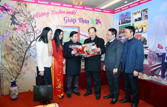 Trưởng ban Tuyên giáo Thành ủy Nguyễn Doãn Toản tham quan gian trưng bày của Báo Hànộimới.